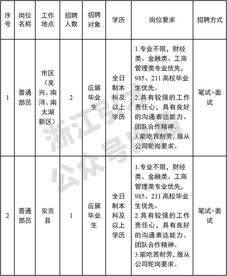 公司为市属一级企业,独立运行,由市财政局履行国有金融资本出资人职责,由市府办(金融口)履行行业监管职责,是一家纳入国家融资担保体系的市级国有全资政府性融资担保机构。 在湖州市财政局的坚强领导下,公司已先后在南浔区、长兴县、德清县、安吉县等地成立分公司,实现了湖州市业务全覆盖,建立了国、省、市、区县四级联动的担保体系。同时,助力我市推出政府性融资担保机构资本金补充、保费补助、风险补偿、绩效考核、尽职免责等“五项配套制度”,切实扶持我市小微企业和“三农”主体高质量发展。 公司连续两年荣获省政府办公厅“改革创新优秀单位”,连续五年荣获“地方金融组织优秀单位”,连续两年荣获湖州市国家绿色金融改革创新试验区建设优秀地方金融组织等多项省市级荣誉。 现为更好地推动公司发展,根据公司实际情况,拟面向社会公开招聘,现将有关事项公告如下: 一、招聘计划 本次招聘人员3名,具体招聘岗位、人数、专业和有关要求详见《招聘岗位需求表》。 二、招聘条件 (一)主要面向全日制本科及以上的应届毕业生,包括2025年应届毕业生及2023年、2024年毕业且在择业期内未与工作单位签订过劳动、聘用合同,或用人单位未缴纳社保,其户口、档案、组织关系仍保留在原毕业学校,或保留在各级毕业生就业主管部门(毕业生就业指导服务中心)、各级人才交流服务机构和各级公共就业服务机构的人员。 (二)遵守国家法律、法规和各项金融规章制度,品德优良、作风正派、诚信廉洁、勤奋敬业,无不良记录。 (三)具备良好的沟通能力和人际关系处理能力,服从公司工作安排,具有强烈的责任心、服务意识和爱岗敬业精神。 (四)身体健康,具有正常履行工作职责的身体条件,具备健康良好的心理素质。 三、招聘程序 本次招聘采取发布公告、报名、资格审查、笔试、面试、体检、考察等程序进行,薪资待遇情况面谈。 (一)公开报名 1、报名时间:2024年11月22日至2024年12月13日 2、报名方式:采用网上报名方式进行报名 3、报名材料:报名者从公告附件中下载报名表(见附件),将身份证、学历证书、学信网学历电子注册备案表、个人简历、工作证明、其他相应证书,连同两寸免冠照片以电子文档(电子照片)或扫描件的形式一并打包发送至公司报名邮箱。“邮件名”请命名为“应聘+姓名”。 4、岗位招聘人员与符合条件的报名人员达到1:3比例方能开考;各岗位通过资格审查人员不足招聘计划数开考比例的岗位,将取消招聘计划。招聘计划取消的,应聘该岗位人员可自接到取消计划通知起24小时内进行改报名,逾期未改报名的,视作放弃改报名。 (二)资格审查 报名结束后,由公司综合部对报名人员进行资格初审,符合条件人员将进入考核环节。 (三)笔试、面试 资格初审后确定笔试入围人员,笔试成绩占总成绩的30%,笔试结束后,根据笔试成绩按1:5确定面试人员,面试成绩占总成绩的70%。具体笔试、面试时间地点另行通知(未进入笔试、面试名单不再另行通知)。 面试当天进行资格复审,报名人员须提供本人身份证、户口簿(户籍证明)、学历证书、学信网学历电子注册备案表、个人简历、工作证明、其他相应证书的原件和复印件,本人近期2寸彩色免冠证件照2张。未携带原件或原件与报名材料不符者取消面试资格。资格复审合格者参加面试。未按规定时间地点参加资格复审的,视作放弃资格复审及面试。 笔试和面试时间、地点另行通知。 (四)体检 根据总成绩由高分到低分排序,确定体检对象,体检项目和指标,参照公务员录用通用标准执行。 (五)考察 对体检合格人员进行全面考察,重点是对思想政治表现、道德品质、工作能力、现实表现等进行考察。 (六)公示聘用 经体检、考察合格后,对拟聘用人员进行公示,公示期为5个工作日。 在体检、考察、公示等环节,入围人员自愿放弃,或出现不宜聘用情形的,取消聘用资格,空缺职位根据公司实际情况确定是否需要递补,若有则通过总成绩高低顺序依次递补。 拟聘用人员名单公示无异议后,按公司规定程序办理相关入职手续。 四、其他事项 (一)请应聘者保持通讯工具畅通,以便工作人员和您取得联系; (二)应聘者需对个人信息的完整性和真实性负责,如提供虚假信息或有意隐瞒情况者,一经发现取消聘用资格; (三)应聘资料进入公司人才储备库,未被录用者的资料公司代为保密,恕不退还,敬请谅解。 报名邮箱:office@zcrzdb.com 联系人:季女士 联系电话:0572-2037950 附件:报名表 扫描识别二维码下载报名表