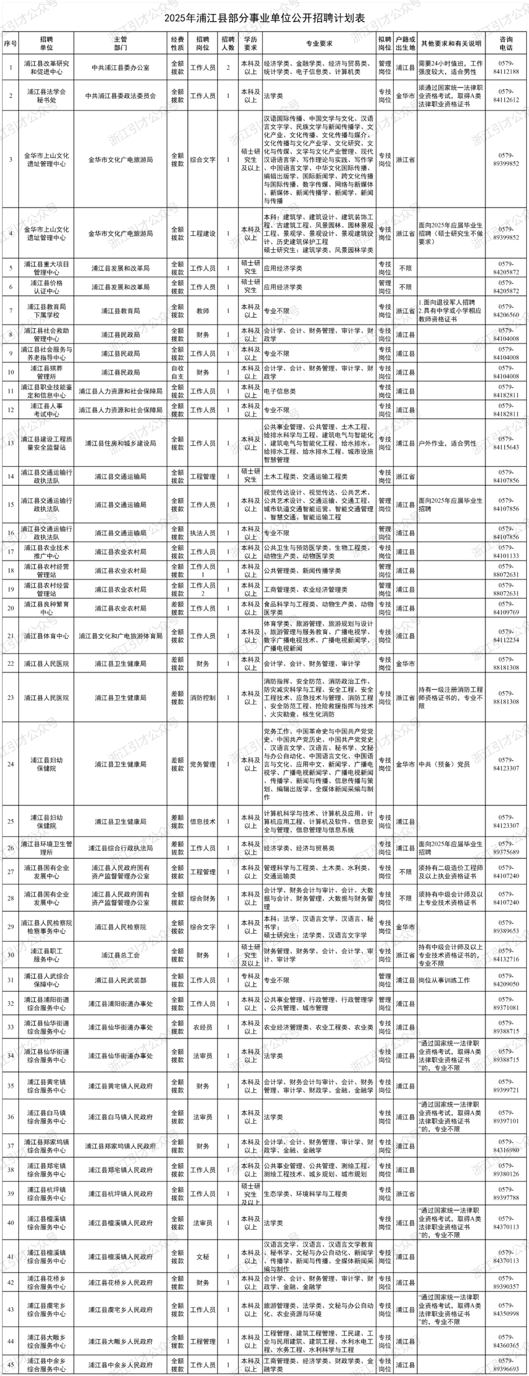 因工作需要,受各招聘单位委托,根据《关于进一步做好事业单位公开招聘工作的通知》《浙江省事业单位公开招聘人员暂行办法》等有关规定,经研究决定,2025年浦江县部分事业单位面向社会公开招聘工作人员45名,面向退役军人招聘工作人员1名,现将有关事项公告如下:2025年浦江县部分事业单位公开招聘计划详见《2025年浦江县部分事业单位公开招聘计划表》,包括招聘单位、招聘岗位、招聘人数、学历要求、专业要求、户籍或出生地及其他要求和有关说明等。1.具有中华人民共和国国籍,遵守国家宪法、法律、法规,愿意履行事业单位人员的义务。2.具有符合计划表中对应户籍或出生地(以身份证号码为准)、学历、专业、其他等要求的各类高校毕业生。其中硕士研究生及以上学历学位人员报考本次招聘岗位的,户籍或出生地放宽至浙江省。3.在2025年6月2日前通过自学考试、成人高考、网络教育、远程教育等考试并取得毕业证书的人员,在2025年6月2日前取得教育部留学服务中心出具的国外学历学位认证书的人员,符合岗位资格条件的可以报考。4.本县事业单位正式在编人员、现役军人、全日制普通高校在校在读生不能报考;在普通高校脱产就读的非2025年应届毕业的专升本人员、研究生不能以原已取得的学历、学位证书报考;涉嫌违纪违法正在接受纪检监察机关或者司法机关审查尚未作出结论的不能报考;受党纪、政务处分且至公告发布之日尚在影响期的不能报考;具有法律、法规规定不得聘用为事业单位工作人员的其他情形人员不能报考。1.报考人员应当具备《浙江省事业单位公开招聘人员暂行办法》中规定的基本条件和招聘岗位所需具体条件;鉴于本次招聘的体检和考察工作将参照现行公务员考录工作的办法进行,身体状况不符合《公务员录用体检通用标准(试行)》或存在不宜录用为公务员的各类情形的人员,不宜报考。2.报考人员不得报考与招聘单位有《浙江省事业单位公开招聘人员暂行办法》第三十条所列回避情形的岗位。3.年龄18至35周岁(1989年6月4日至2007年6月3日期间出生)。本次招聘采取网上报名及缴费确认方式。招聘工作贯彻公开、平等、竞争、择优的原则,按照发布公告→网上报名→资格初审→缴费确认→笔试→资格复审→面试→体检→考察→公示→办理聘用手续的程序进行。报名时间:2025年6月12日9时—6月18日17时报名网址:浙江省通用招聘网报平台(http://qssy.zjks.com/)报考人员需仔细阅读诚信报考承诺书,按要求如实、准确、完整地填写有关信息并选择岗位进行报名,仅注册不选择岗位视为无效报名,逾期不再受理注册及报名。报名与考试使用的身份证号必须一致。资格初审时间:2025年6月12日9时—6月19日17时由招聘单位或主管部门负责对报考人员选定的岗位进行资格初审,对初审未通过的人员说明理由。通过资格初审的不能再报考其他岗位,未通过的报考人员可在报名时间内再次报名并接受资格初审。缴费时间:2025年6月20日9时—6月24日17时通过资格初审的报考人员需在浙江省通用招聘网报平台办理网上缴费,缴纳考试费50元。逾期不缴费的,视作放弃笔试资格。贫困家庭的报考人员凭县级民政(扶贫)部门出具的低保证或特困证明免收考试费,请以上报考人员于缴费时间内向浦江县人力社保局事业科提供相关资料。逾期不提供的,视作非贫困家庭报考人员。缴费确认人数不足招聘计划数3倍的岗位,将核减或取消招聘岗位,并在浦江县人民政府网公布。招聘岗位取消的,应聘该岗位人员可自公布取消岗位之日(含)起2日内进行改报名。逾期未改报的,视作放弃改报名,退还考试费。下载打印时间:2025年7月2日9时—7月5日11时已缴费人员在规定时间内登录浙江省通用招聘网报平台自行下载打印准考证。报考人员须同时携带准考证和有效身份证件,按照准考证上规定的时间、地点和要求参加考试。笔试满分为100分,笔试成绩合格分数线按照实际参加考试总人数淘汰10%的人数比例划定。合格分数线以上的考生根据笔试成绩从高到低按招聘人数1∶3比例确定面试对象。面试前进行资格复审,由各招聘单位或主管部门组织实施现场资格复审,具体时间、地点另行通知。(2)毕业证书(学位证书)。留学人员应提供教育部留学服务中心出具的国外学历学位认证书;2025年普通高校应届毕业生尚未取得学历(学位)证书的,应提供《就业推荐表》、《教育部学籍在线验证报告》等;未按规定时间、地点参加资格复审的,视作放弃面试资格;材料不全或者所提供的材料与报考岗位资格条件不相符的,取消面试资格。放弃或取消面试资格的,按该岗位笔试合格人员中从高分到低分予以递补,递补人员资格复审由人力社保部门组织实施。面试首日开始前24小时内,报考人员确认不参加面试的,相关岗位不再递补。面试采取结构化面试,面试满分为100分,合格分为60分(各岗位参加面试人员与招聘人数出现1:1的比例时,面试成绩合格分为70分)。面试不合格者,不列入体检、考察对象。面试时间、地点另行通知。本次公开招聘按笔试、面试成绩各占50%计算总成绩,满分100分。若总成绩相等,以笔试成绩高的排位在前。笔试、面试成绩都相同的进行加试,加试时间、地点另行通知。根据总成绩从高分到低分按招聘岗位计划数1:1的比例确定体检人员。体检工作按人力资源和社会保